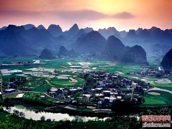 如果说东峰林以田见长,那西峰林则以水取胜。西峰林山脚下有一条弯弯曲曲的小溪,它从农田中缓缓由南往西而流,像一根游线,把依河而偎的几个布依族村寨像珍珠般地串连起来;也像一根晾绳,挂起了一帧奇峰似林、田坝胜锦、村落如珠、古榕若翠的巨幅画卷。