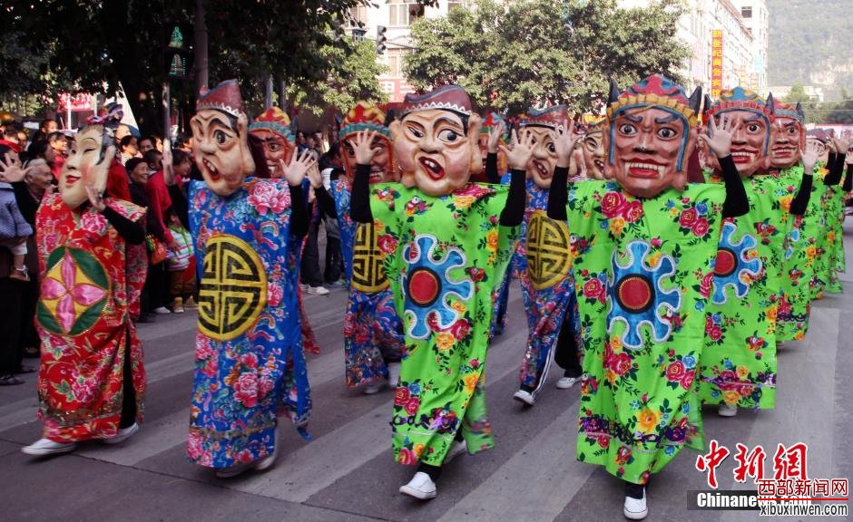 12月1日,在“三姐故里”广西宜州市,大型民俗巡游活动吸引游客。宜州是著名壮族歌仙刘三姐的故乡和“中国第一个村民委员会”诞生地,先后荣获中国优秀旅游城市、中国最具民俗特色旅游目的地、中国最佳生态休闲旅游名城等称号,被誉为中国民间艺术之乡、彩调之乡、山歌之乡。广西河池第十四届铜鼓山歌艺术节暨广西宜州第四届刘三姐文化旅游节11月30日至12月2日在宜州举行。图为民俗巡游现场。