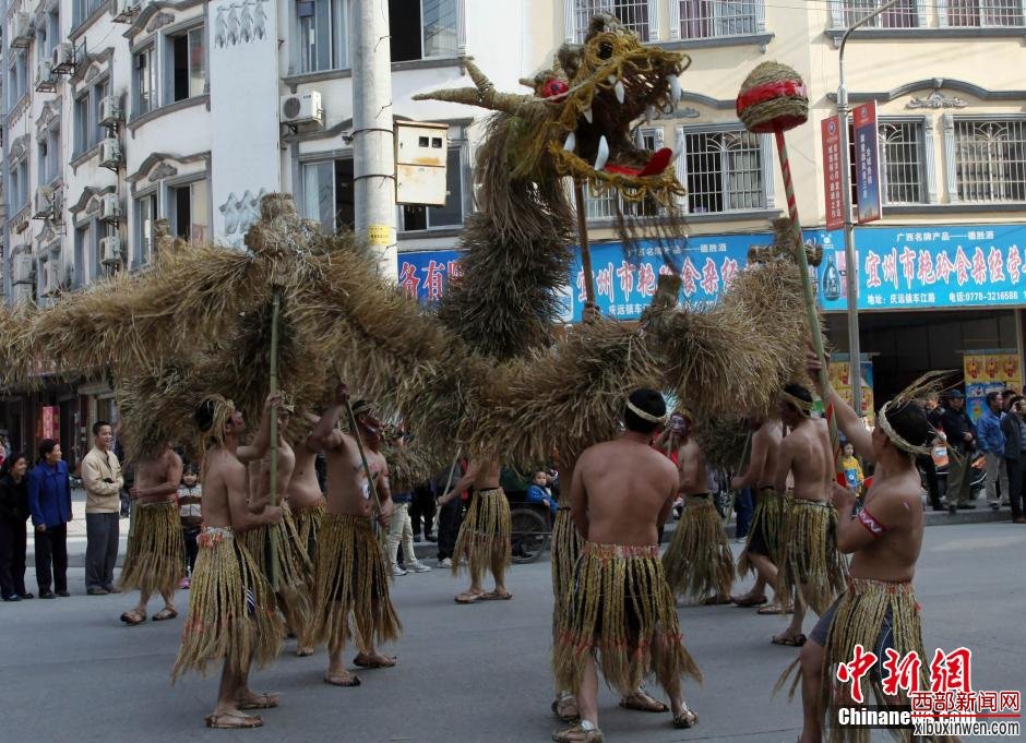 12月1日,在“三姐故里”广西宜州市,大型民俗巡游活动吸引游客。宜州是著名壮族歌仙刘三姐的故乡和“中国第一个村民委员会”诞生地,先后荣获中国优秀旅游城市、中国最具民俗特色旅游目的地、中国最佳生态休闲旅游名城等称号,被誉为中国民间艺术之乡、彩调之乡、山歌之乡。广西河池第十四届铜鼓山歌艺术节暨广西宜州第四届刘三姐文化旅游节11月30日至12月2日在宜州举行。图为民众舞动草把龙。