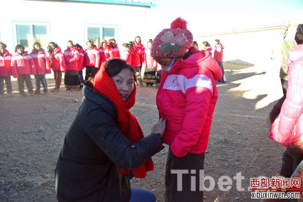 西部新闻网讯  在那曲地区安多县的一所完全小学内,孩子们获得了2014年最早的新年礼物—一件温暖的棉衣和一条爱心人士编织的围脖。这里的冬天异常寒冷,在平均海拔4500米以上,最低气温可达零下30度。孩子们红红的脸蛋儿上露出了开心的笑容,拿着红围巾高兴地又蹦又跳。